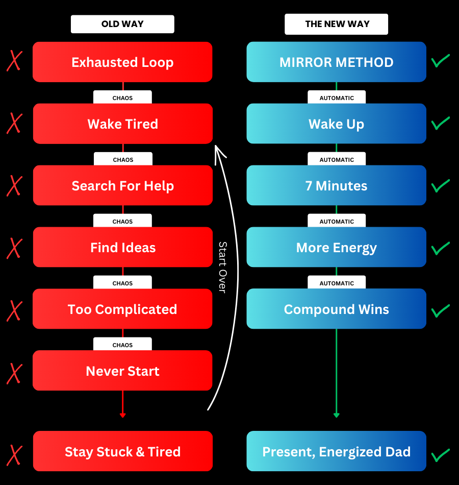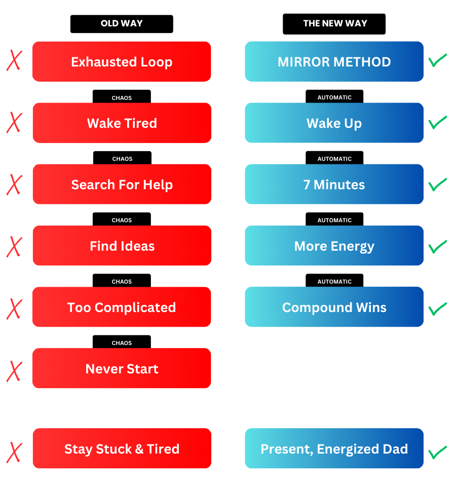 The Mirror Method is a counter-intuitive approach that empowers fathers like you to become the energized, present dad your kids deserve in just 7 minutes each morning...